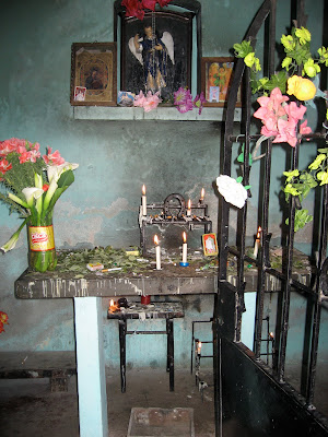 We passed a small chapel used by locals. A lot of cigarettes lit and left to burn down as burnt offerings. (Here as in Afro-Latina religions like voodoo and santeria, gifts of tobacco to Mother Earth are common, and the clever Jesuits allowed the local Incas to synchretize their religions with Catholicism. Those traditions still strong.
