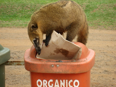 Okay. There are miles of protected semi-tropical bush in all directions around Iguazu Falls. But there’s one very clean little restaurant area. This critter is the Argentinian version of a raccoon. He waltzed right out of the bush. On that trail to the swimming hole I showed you last post Daniel and I passed a family of ten. In the wild, masses of these things can be a bit unnerving, but they’re very safe.