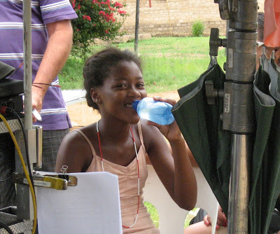 Speaking of Chanda (Khomotso Manyake), she’s a real find. Like all the kids, she’s sooooo natural, and a true delight. The lead adult roles are all played by professional actors out of Johannesburg and Cape Town; that’s also where the lead tech and camera people come from, aside from a few from Germany. But a few of the cameo roles, and all of the kids, are from the area. In fact, in real life, Chanda lives at the end of the road, which is part of what makes the interactions of the child actors and the extras so utterly human and believable. And it’s a main reason why Chanda, Iris, Soly and Esther are so perfect: They never ‘Act’. They simply are — always real and in the moment.