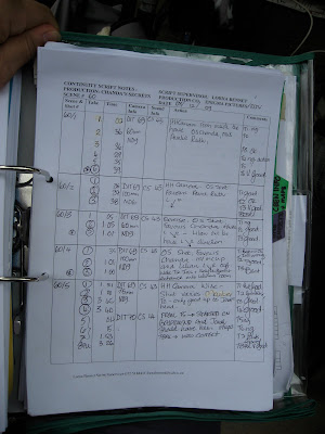 Here’s an example of the kind of book Lorna creates, shot by shot, take by take, for the editors; it includes which takes had sound, line or other problems, which were ideal, and which have sections that can be salvaged with a cross cut.
