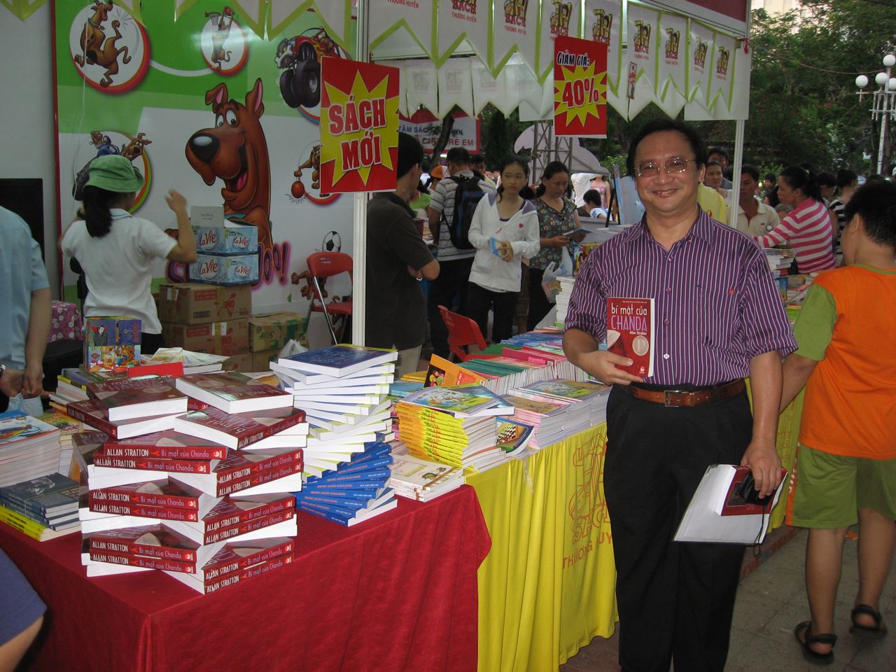 Well, if you’re going to visit a foreign country, what better time to go than during its national book fair? Especially if one’s book is at the fair and one’s publisher is the gracious and generous Mr. Ton Quang Toan, or simply Ton as he likes to be called, of Thuong Huyen Books. This is us in the crowd outside the entrance gate in Ho Chi Minh City (Saigon) — the fair is a really fun, open-air affair.