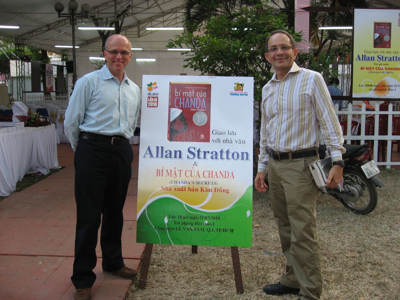 As soon as he heard I was coming Ton did miracles, arranging for the most impressive welcome I’ve ever received at a foreign book fair. First of all, he got a tent for a speaking engagement and a series of print and television interviewers. Here Daniel and I pose out front of the tent by a sign with the book’s cover in Vietnam.