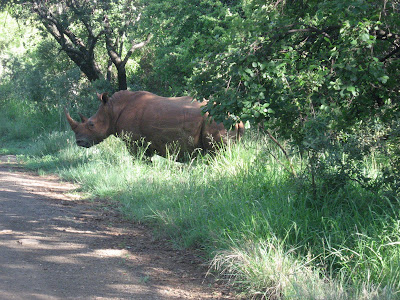 Okay. So. Hyenas eat what’s left of an animal after the meat’s been consumed by lions and leopards and etcetera. In short, they eat the bones. As a result, their stools are hard and white from all the calcium. Hold that thought! Rhino ahead!